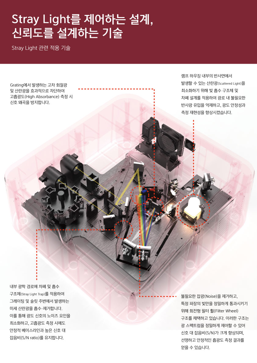 정확한 흡광도 측정을 위해 내부 광학 구조에 Stray Light 차폐 및 흡수 설계를 적용했습니다.